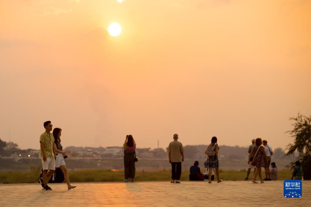 2月8日,游客在老撾首都萬(wàn)象湄公河邊廣場(chǎng)休閑。