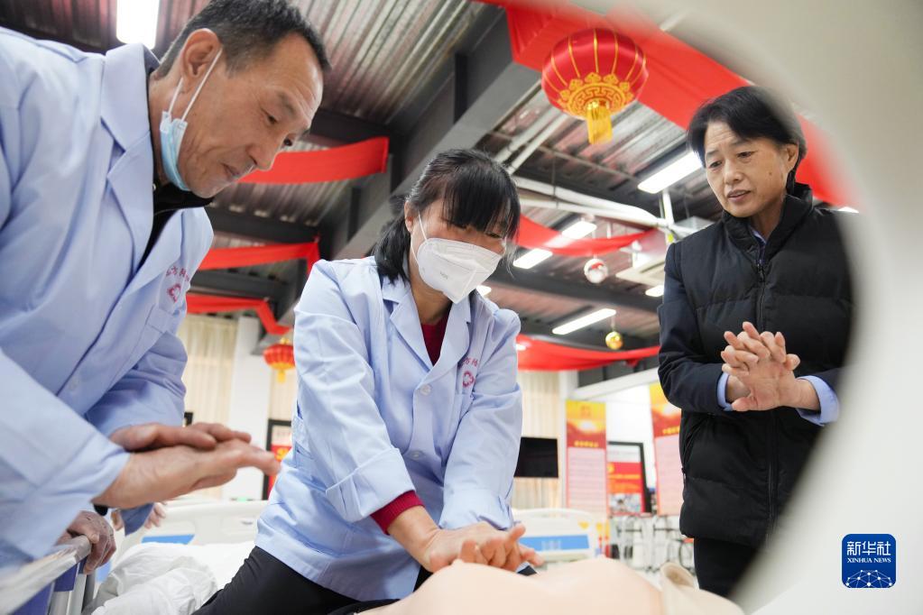 薛四四(中)在北京市今日東方家政服務(wù)公司的護工崗前培訓上練習基本急救操作(2月8日攝)。