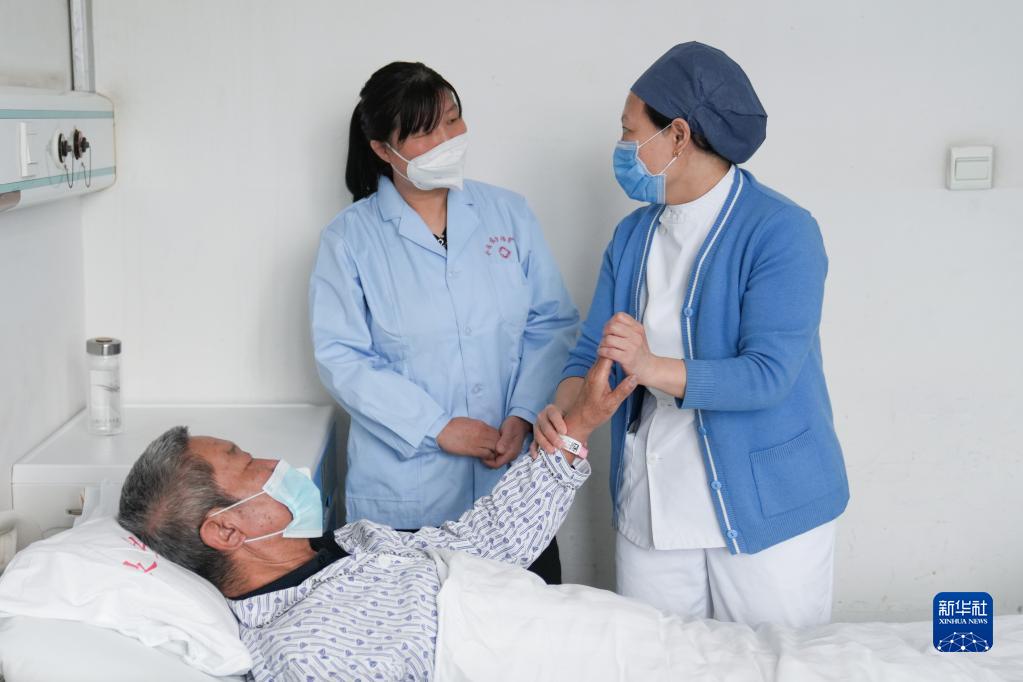 在北京市房山區良鄉醫院神經(jīng)內科三病區,一位護士(右)為新上崗的薛四四(中)講解科內病人護理的一些知識(2月10日攝)。
