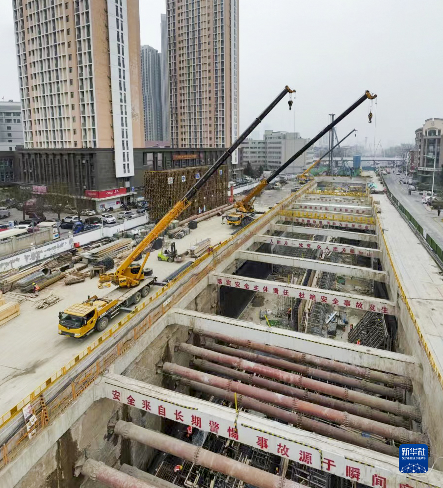 在天津地鐵8號線(xiàn)一期工程5標項目湘江道站至土城站區間明挖停車(chē)線(xiàn)現場(chǎng),大型機械在吊運施工裝備(2月11日攝,無(wú)人機照片)。