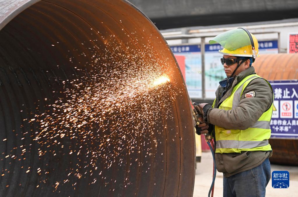 在天津地鐵8號線(xiàn)一期工程5標項目南珠橋站施工現場(chǎng),建設者進(jìn)行切割作業(yè)(2月11日攝)。