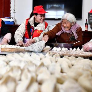 2月12日,在鄆城縣鄆州街道王沙灣村,鄆城縣居家養老服務(wù)中心的工作人員和魏金蘭(右二)老人一起包餃子。