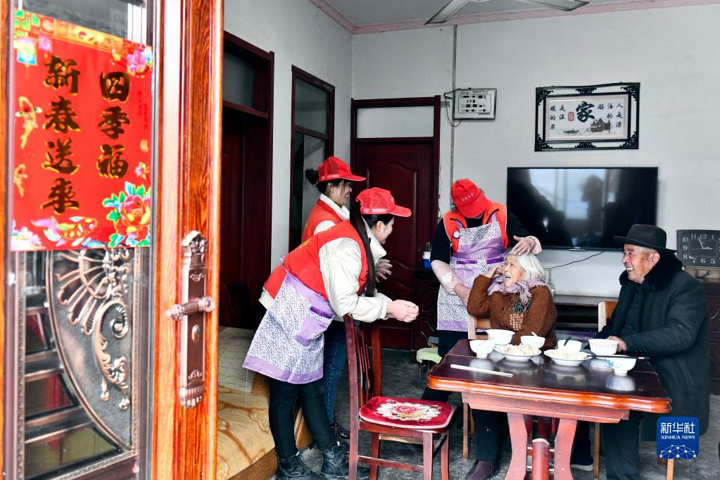 2月12日,在鄆城縣鄆州街道王沙灣村,鄆城縣居家養老服務(wù)中心的工作人員陪魏金蘭(右二)、沈宜明(右一)聊天。