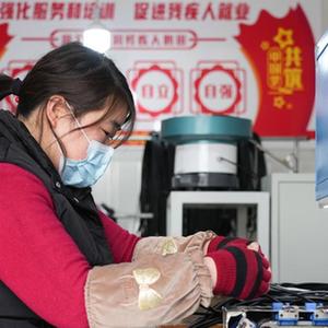 2月12日,在山東鄒城市太平鎮如康家園內,殘疾人在進(jìn)行電纜加工。