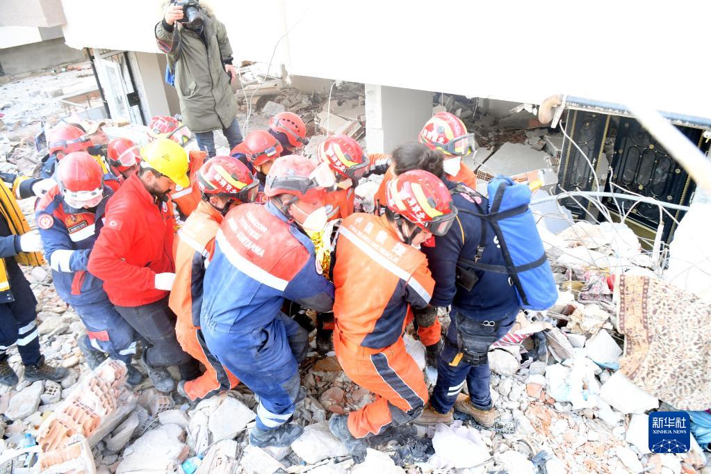 2月12日,在土耳其哈塔伊省安塔基亞市,中國救援隊轉移一名救出的幸存者。