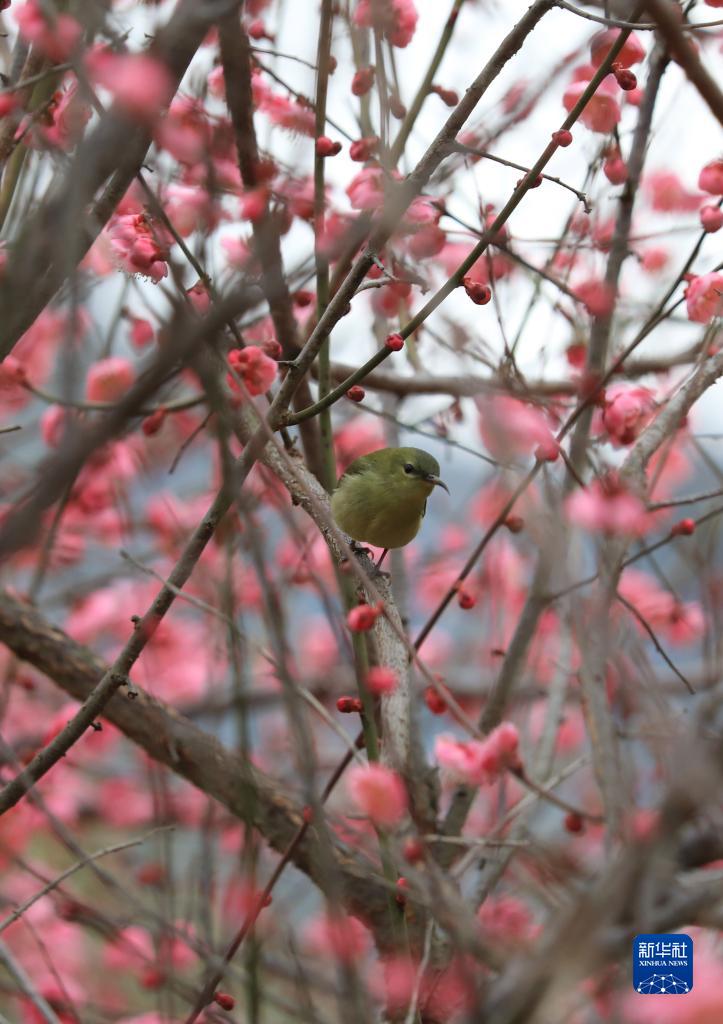 2月12日,鳥(niǎo)兒在貴州省銅仁市江口縣太平鎮云舍村濕地公園梅花叢中棲息。
