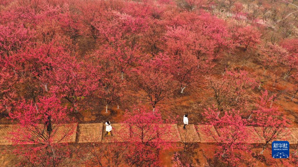 2月12日,游客在湖南省常寧市羅橋鎮廟山村櫻花園賞櫻游玩(無(wú)人機照片)。