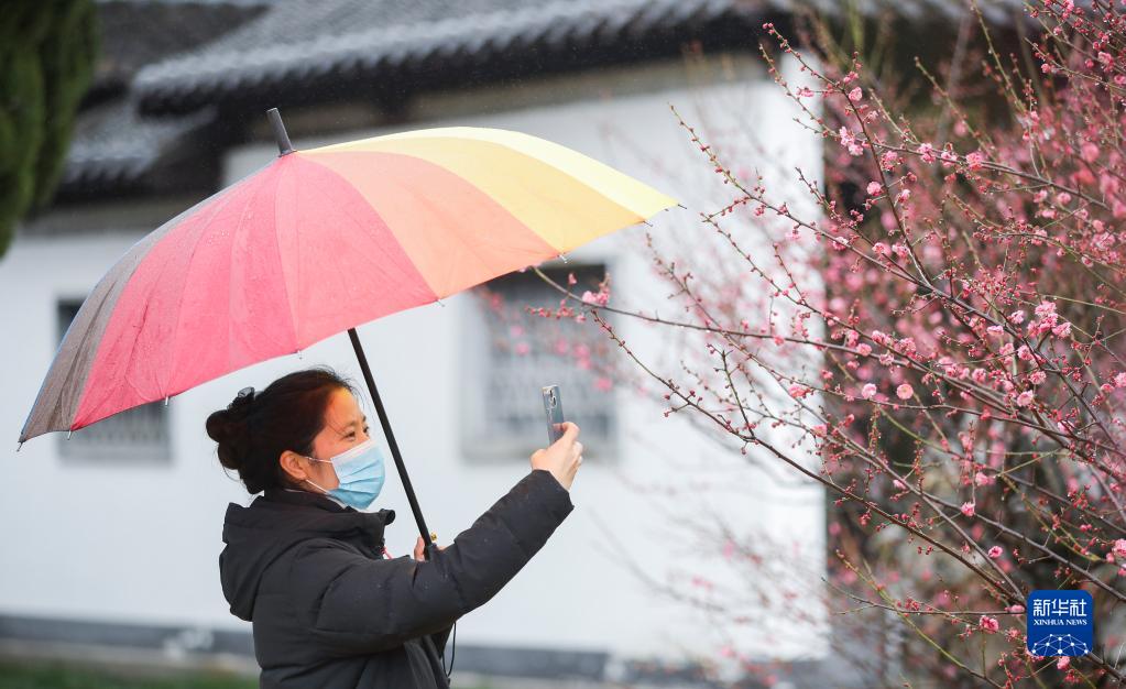 2月12日,游客在江蘇淮安清晏園欣賞梅花。