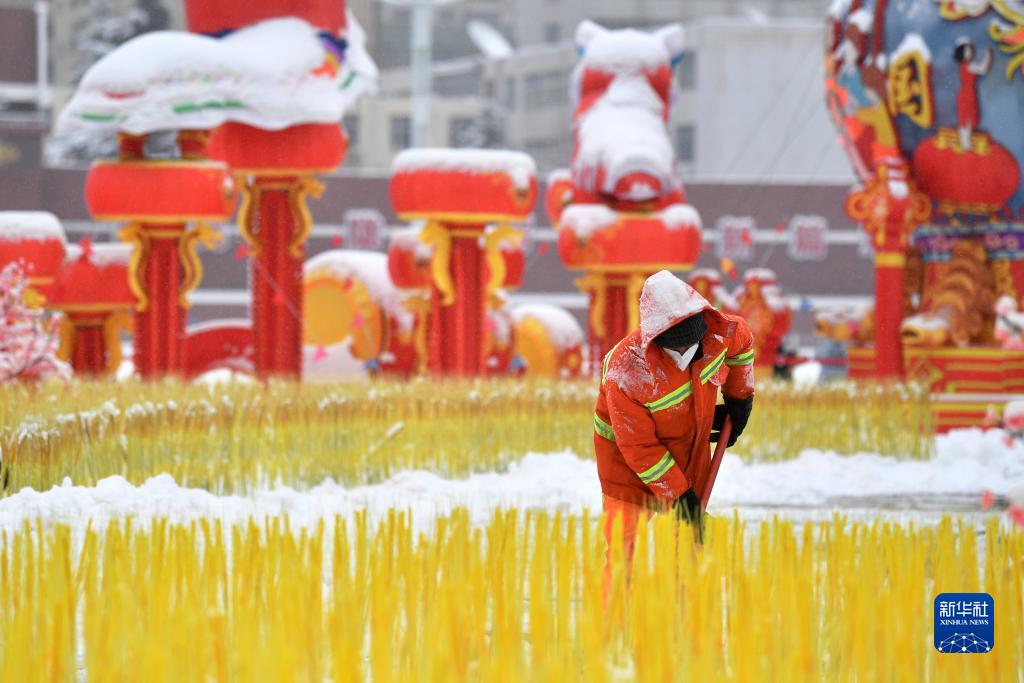 2月13日,一名環(huán)衛工人在蘭州市城關(guān)區東方紅廣場(chǎng)清理積雪。