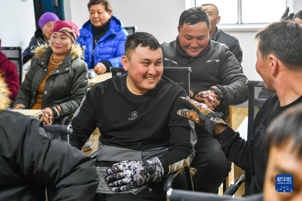 在新疆裕民縣巴爾魯克牧業(yè)幸福驛站的小教室,牧民阿依巴爾·阿斯哈爾(中)參與知識問(wèn)答后,獲得一副手套作為獎品(2月9日攝)。
