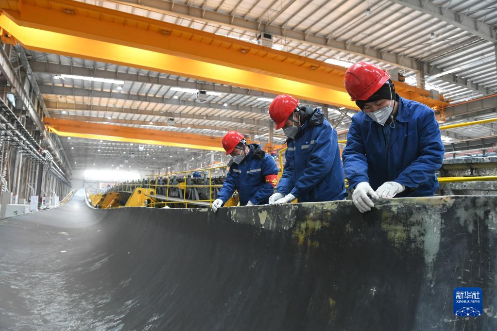 2月13日,工人在內蒙古包頭市明陽(yáng)新能源裝備智能制造產(chǎn)業(yè)園風(fēng)力發(fā)電葉片生產(chǎn)車(chē)間內作業(yè)。