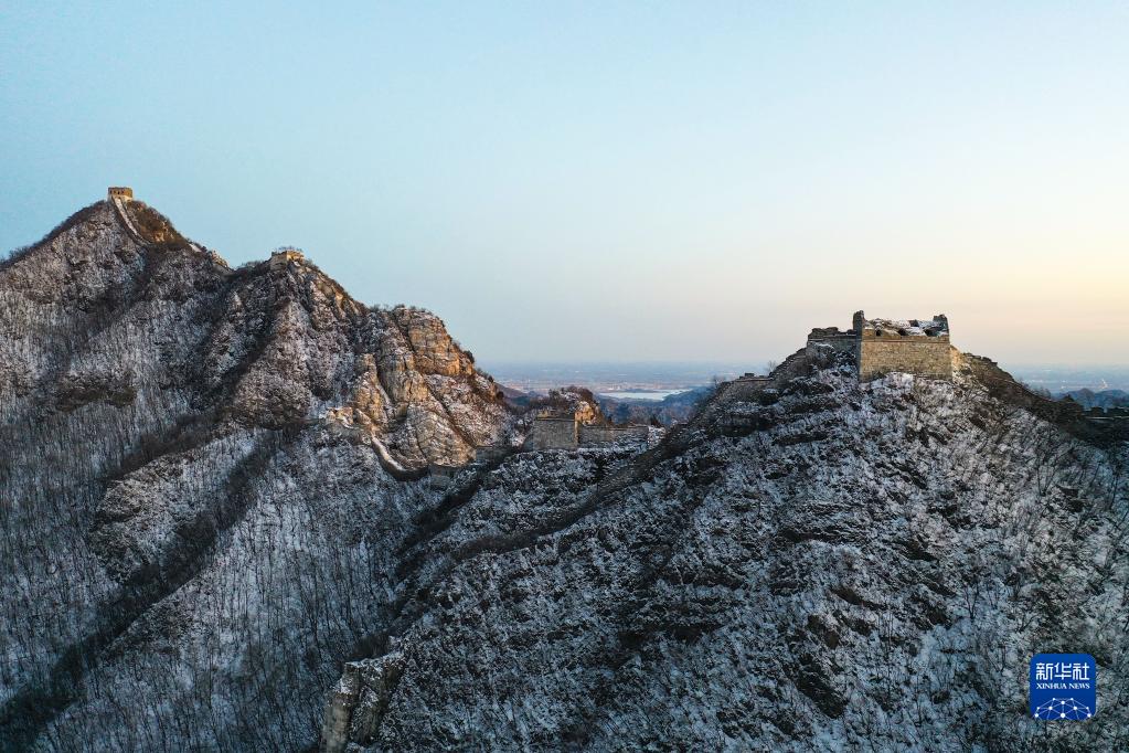 夕陽(yáng)下的箭扣長(cháng)城雪景(2月13日攝,無(wú)人機照片)。