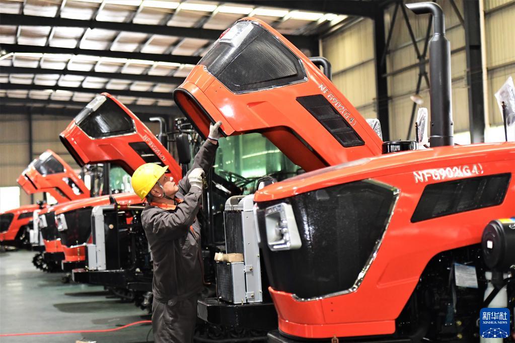 2月13日,在湖南省郴州市高新區一電機公司生產(chǎn)車(chē)間,工人在安裝拖拉機引擎蓋密封條。