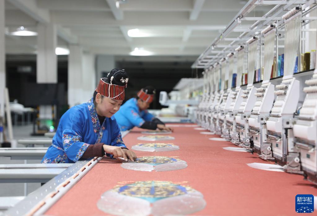 2月13日,貴州省黔東南苗族侗族自治州施秉縣工業(yè)園區,工人在機繡車(chē)間作業(yè)。