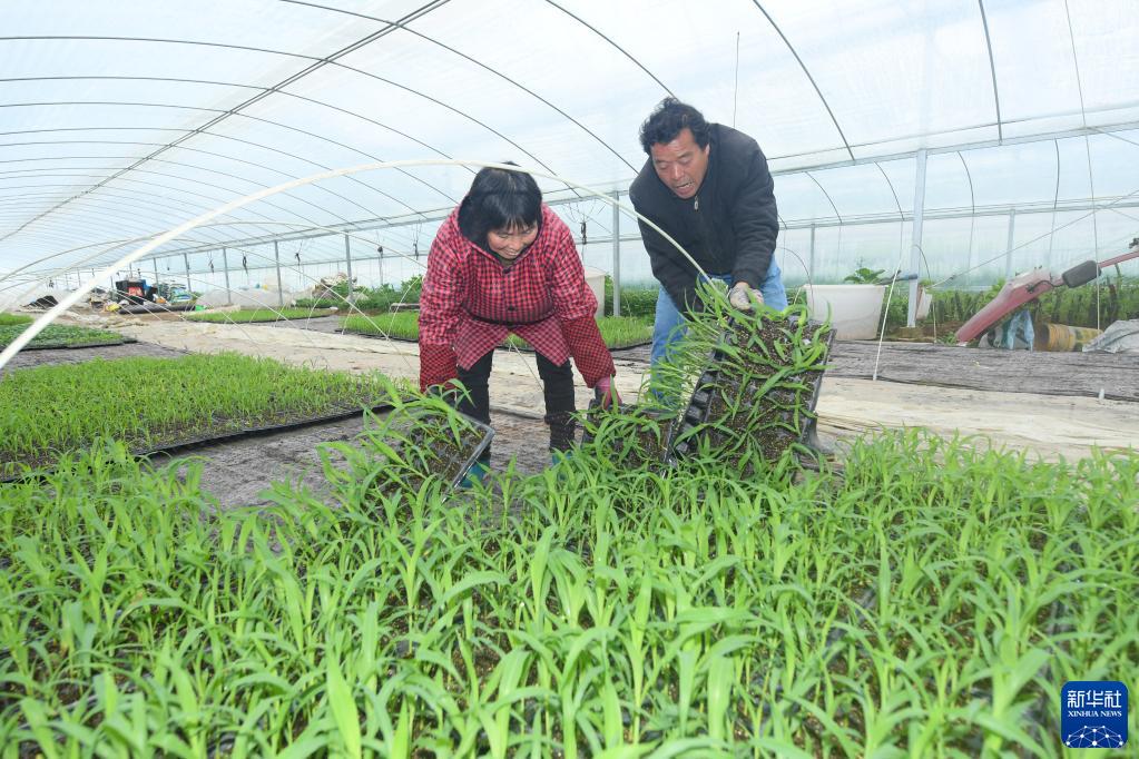 2月14日,在航頭鎮航川村,農戶(hù)將培育的玉米秧移到田里定植。