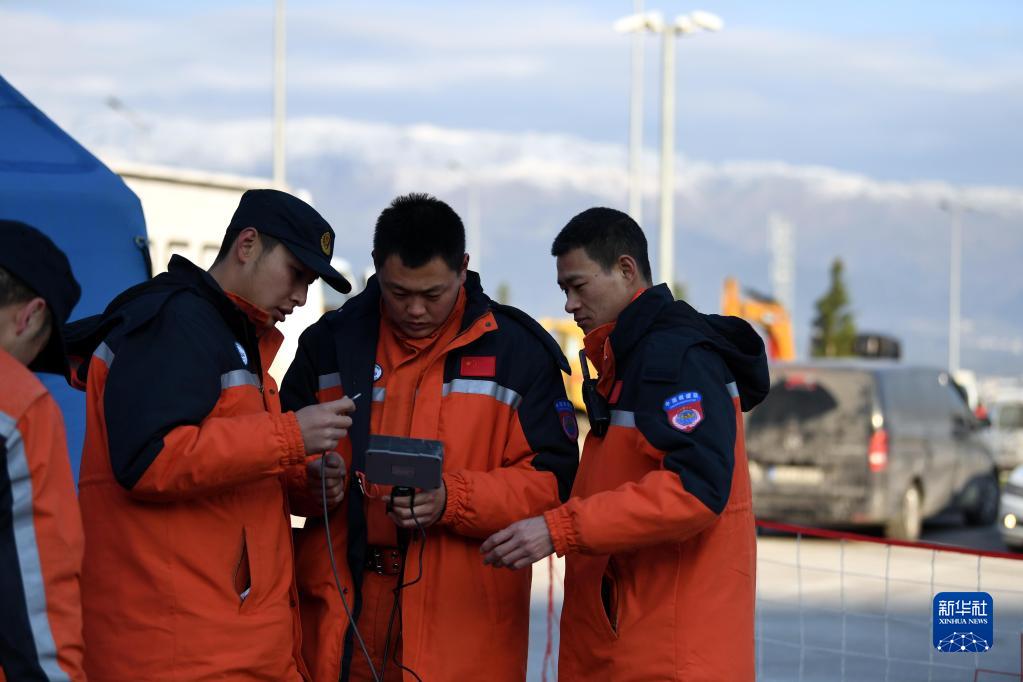 2月11日,在位于土耳其哈塔伊省哈塔伊體育館外的中國救援隊營(yíng)地,救援隊隊員檢查設備。