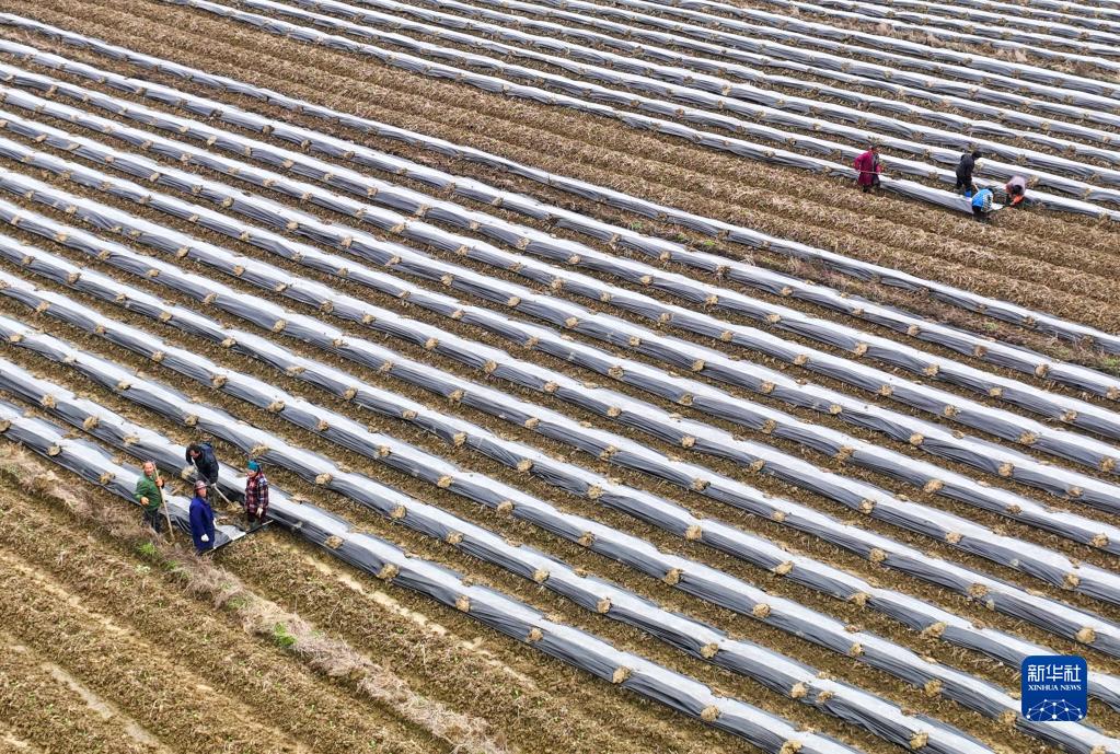 2月14日,在湖南省永州市道縣祥霖鋪鎮上渡村,農民在給剛移栽的農作物覆膜(無(wú)人機照片)。