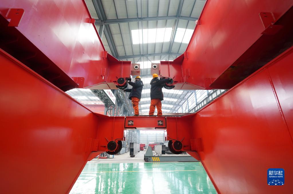 2月14日,工人在唐山市豐潤區一家起重設備制造企業(yè)的生產(chǎn)車(chē)間工作。