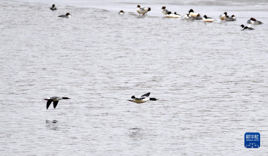 各種鳥(niǎo)類(lèi)在北京園博湖上棲息、飛翔(2月14日攝)。