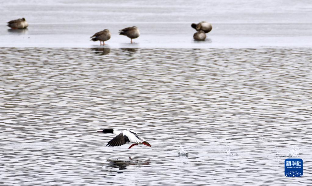 各種鳥(niǎo)類(lèi)在北京園博湖上棲息、飛翔(2月14日攝)。