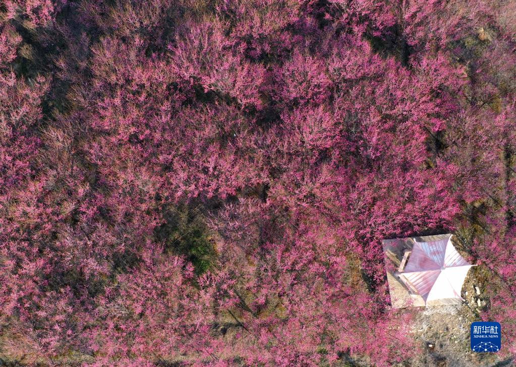 早春時(shí)節,位于安徽省巢湖市廟崗鎮清水灣梅花園的千畝梅花相繼盛開(kāi),朵朵梅花如霞似火,吸引人們徜徉花海,感受春日的美好。