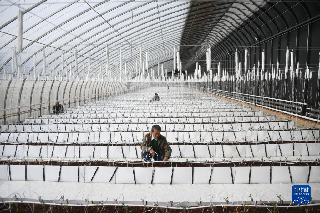 2月15日,北京市峪口鎮京瓦溫室園藝示范園的工作人員在新型日光溫室內查看基質(zhì)栽培技術(shù)種植的番茄植株生長(cháng)情況。