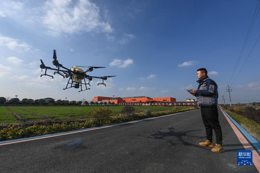 2月15日,在浙江省嘉興市南湖區余新鎮的一片農田里,工作人員在操作無(wú)人機給小麥施肥。