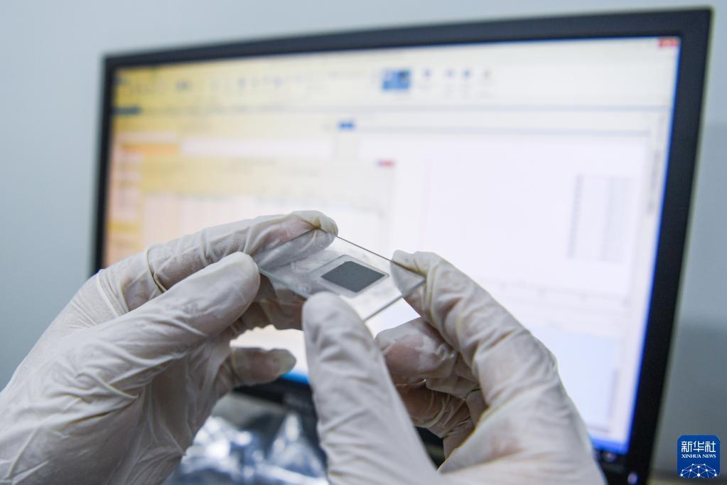 江蘇省先進(jìn)碳材料分析測試中心的技術(shù)人員展示即將進(jìn)行檢測的石墨烯導熱膜(2月14日攝)。