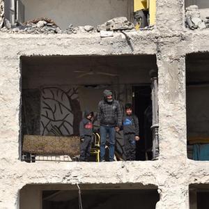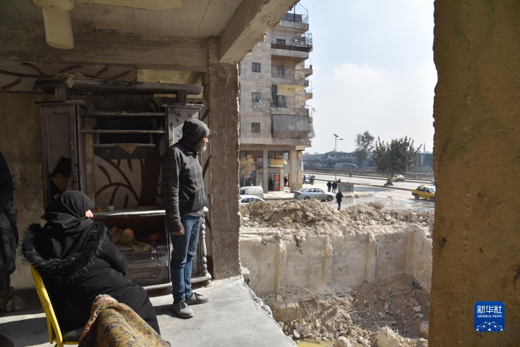2月13日,在敘利亞地震災區阿勒頗,一名男子站在受損的建筑中向外張望。