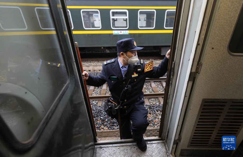 2月14日,列車(chē)在信陽(yáng)站??科陂g,車(chē)輛乘務(wù)員李金文進(jìn)行巡察。