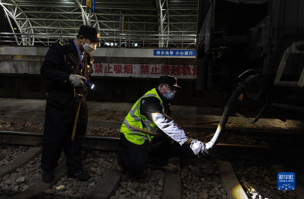 2月14日,在列車(chē)??磕暇┱酒陂g,車(chē)輛乘務(wù)員李金文(左)協(xié)助車(chē)輛段客車(chē)檢車(chē)員張晨檢查機車(chē)車(chē)頭與車(chē)廂間的空氣制動(dòng)裝置。張晨今年第一次參加春運。