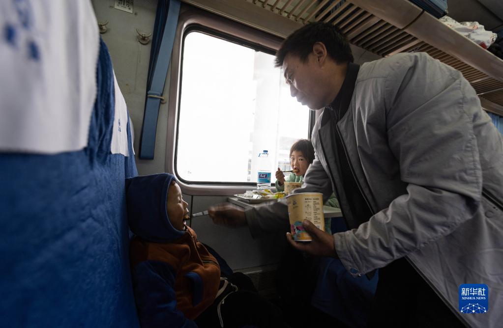 2月14日,在臨客K4618次列車(chē)上,一位父親照顧孩子吃飯 。