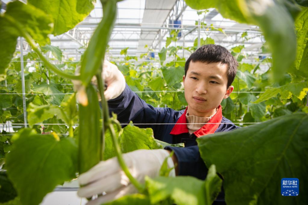 2月15日,工作人員在蔬菜工廠(chǎng)采收水果黃瓜。