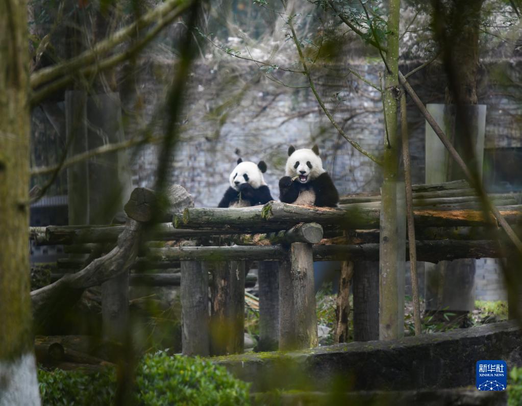 2月15日,在中國大熊貓保護研究中心都江堰基地,大熊貓在吃竹子。