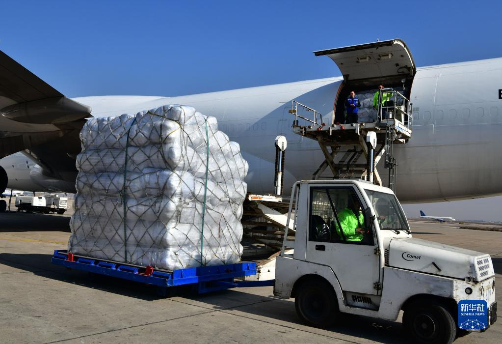 2月15日,工作人員在敘利亞大馬士革國際機場(chǎng)卸載中國政府援助的人道主義物資。