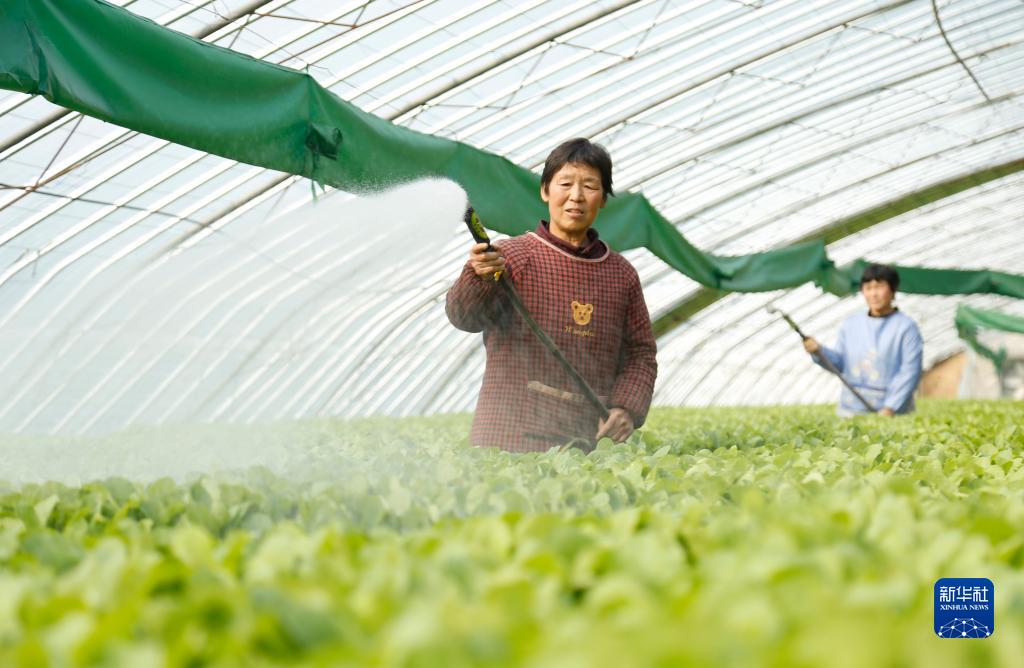 2月15日,在邢臺市南和區一處育苗基地內,農民在給蔬菜秧苗澆水。