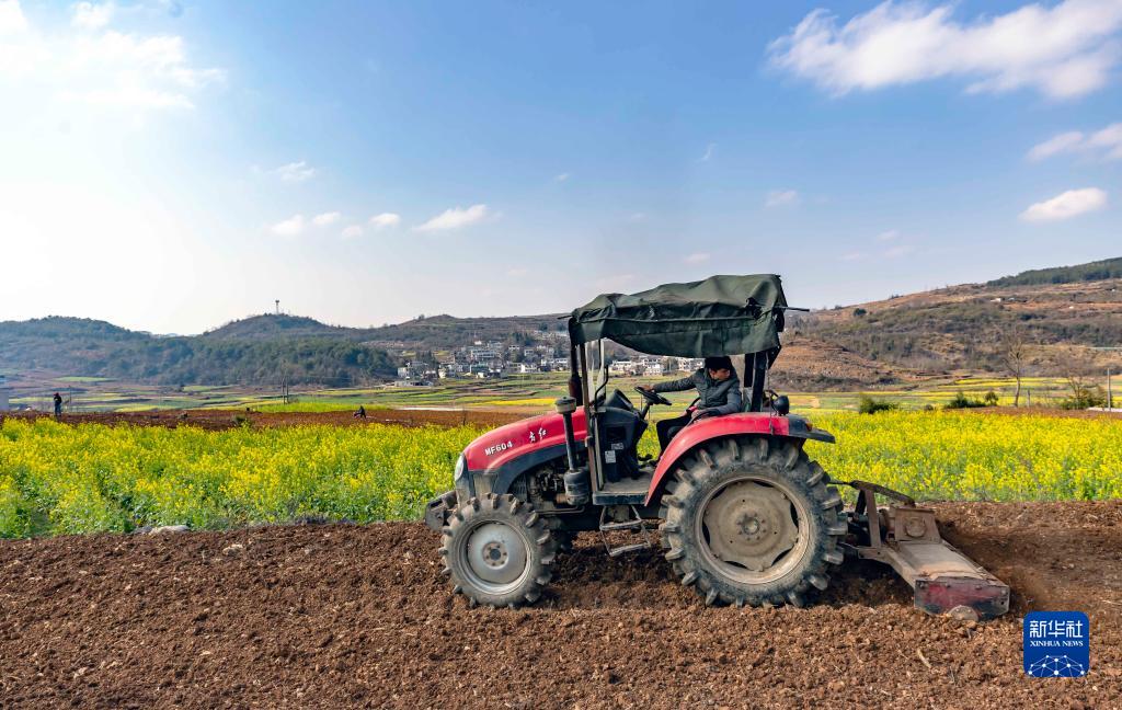2月14日,村民在貴州省黔西市金碧鎮新團村耕地。