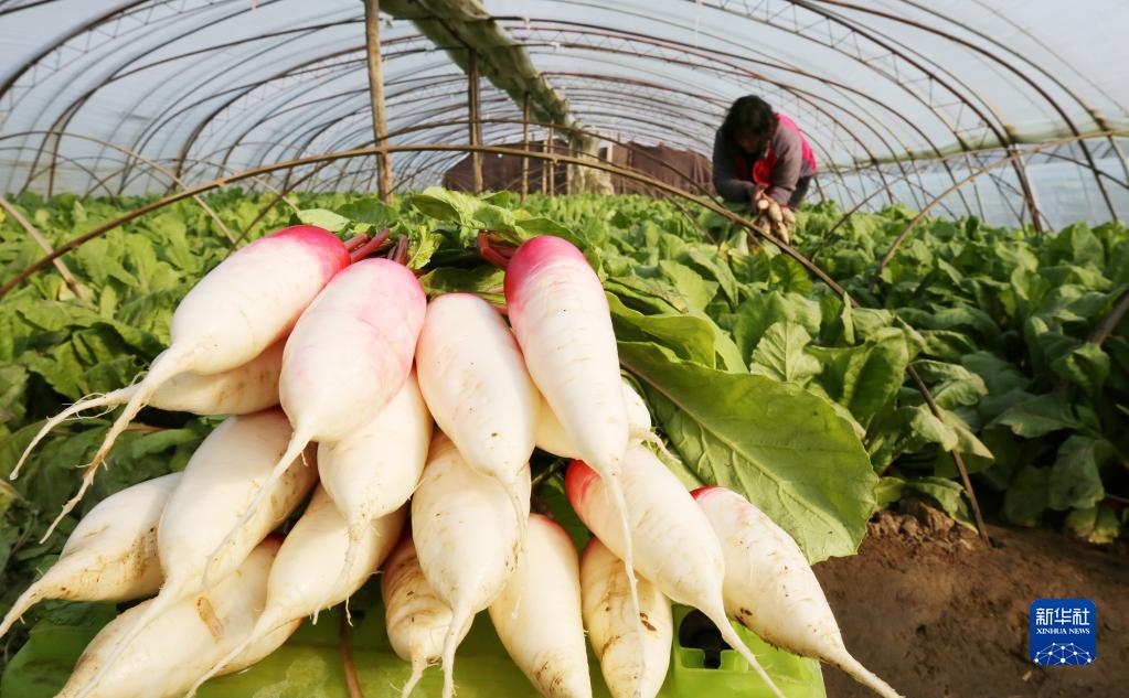 2月16日,山東省臨沂市郯城縣郯城街道薛城后村的村民在大棚內采收蘿卜。