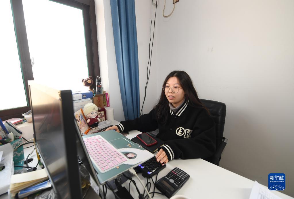 楊鑫博在項目部辦公室工作(2月15日攝)。