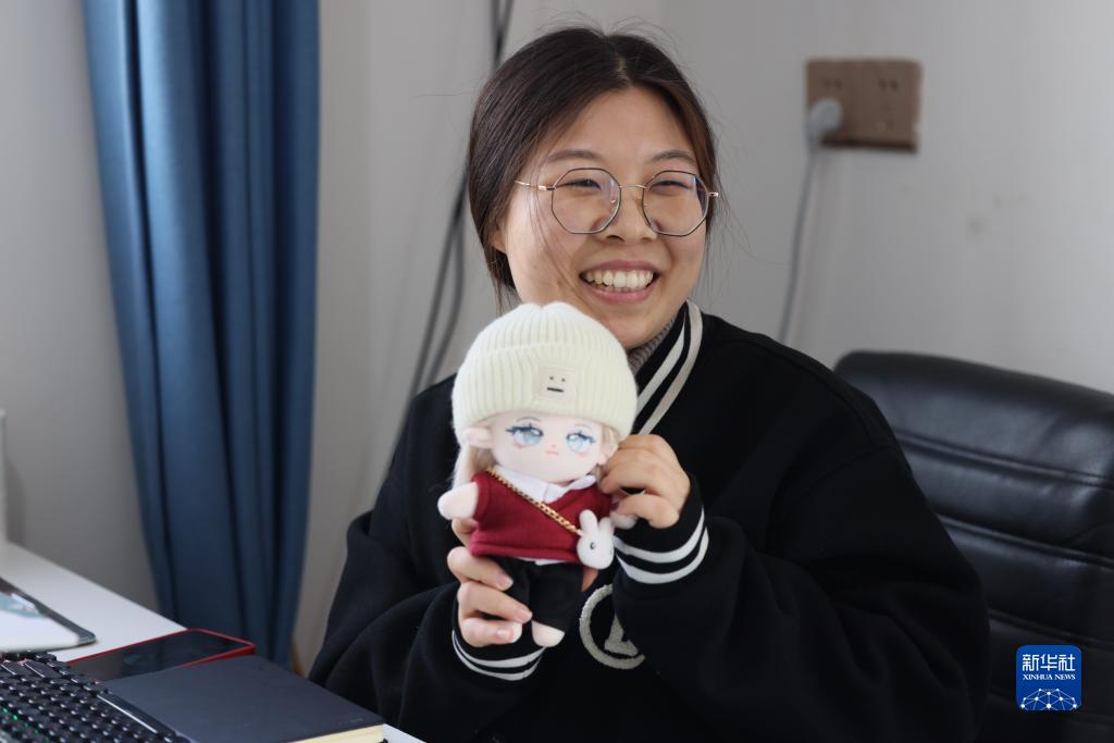 楊鑫博在項目部辦公室展示新購買(mǎi)的玩偶(2月15日攝)。