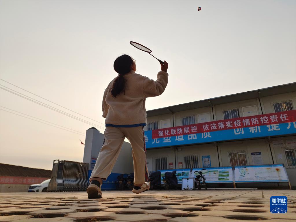 楊鑫博在項目部小院打羽毛球(2月15日攝)。