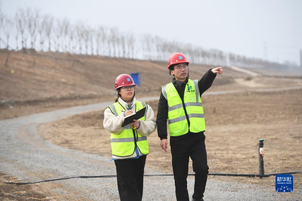 楊鑫博(左)和同事在雄安唐河河谷郊野公園項目現場(chǎng)工作(2月15日攝)。
