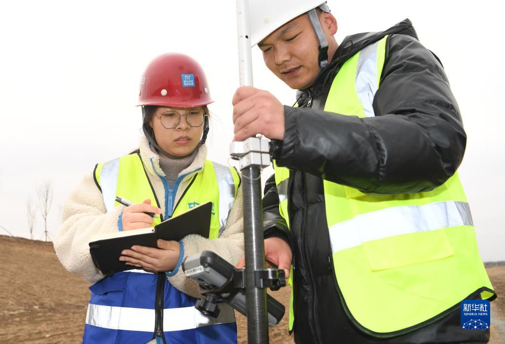 楊鑫博(左)和同事在雄安唐河河谷郊野公園項目現場(chǎng)勘測(2月15日攝)。