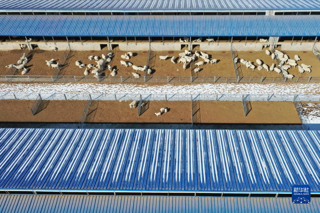 這是2月15日拍攝的甘肅羊如祥農業(yè)有限公司良種肉羊繁育場(chǎng)內景象(無(wú)人機照片)。