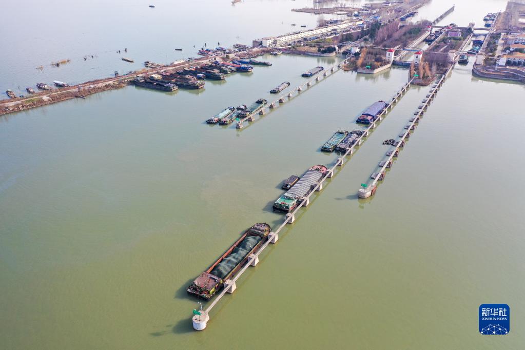 2月14日,貨船有序通過(guò)位于江蘇宿遷的京杭大運河皂河船閘(無(wú)人機照片)。