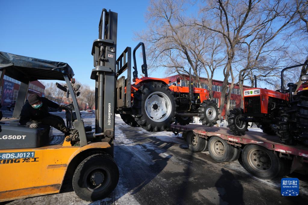 2月16日,佳木斯驥馳拖拉機制造有限公司大院,叉車(chē)向運輸車(chē)上運送拖拉機。