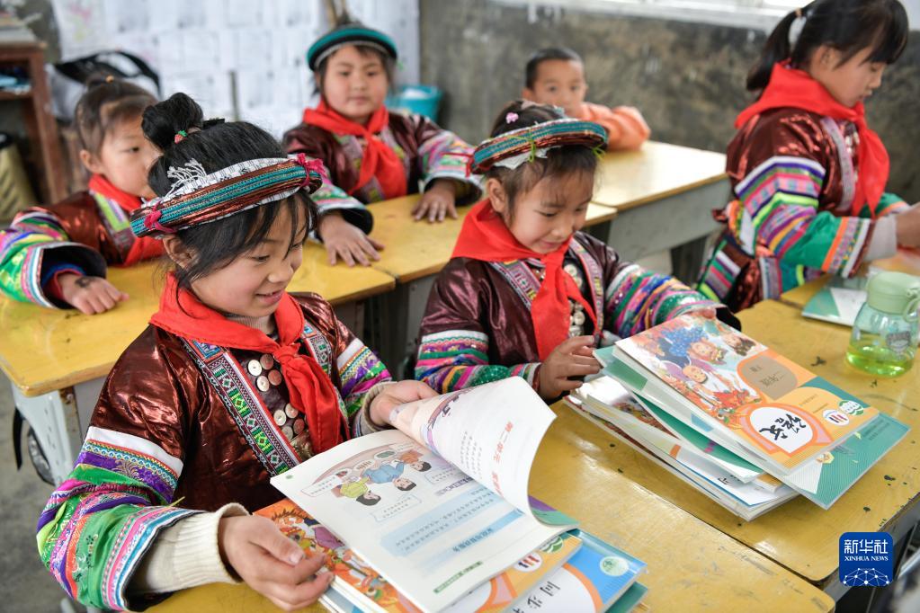 2月16日,貴州省從江縣西山鎮中寨教學(xué)點(diǎn)學(xué)生領(lǐng)到新書(shū)。