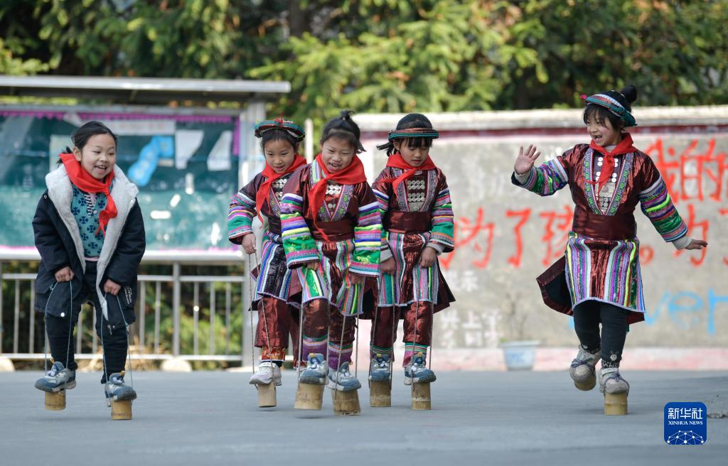 2月16日,貴州省從江縣西山鎮中寨教學(xué)點(diǎn)學(xué)生在課外活動(dòng)中比賽踩高蹺。