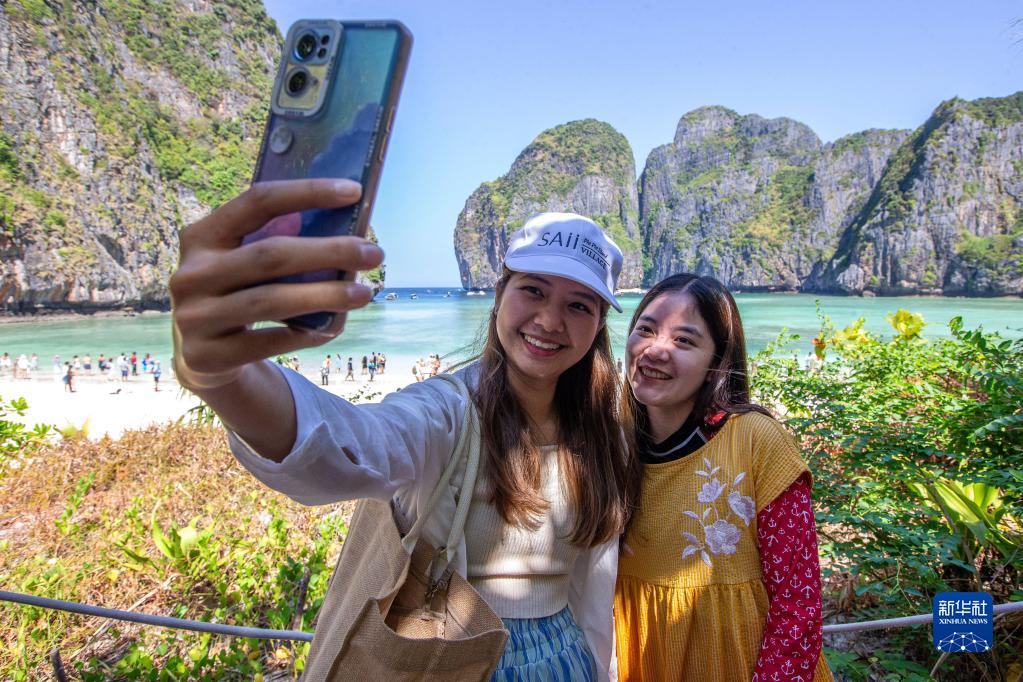 2月16日,游客在泰國皮皮島國家公園自拍。