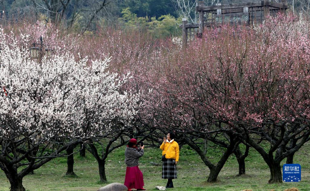 2月17日,游客在江蘇蘇州上方山國家森林公園內賞花拍照。